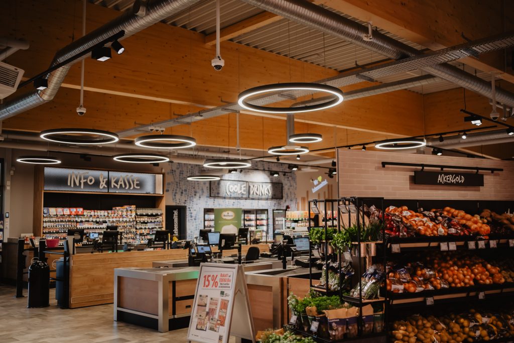 Moderne Stahlregale und Gitterelemente, gepaart mit Holzdekoren, frischen Farben und auflockernden Deko-Ideen, geben dem Markt einen besonderen Charme.
