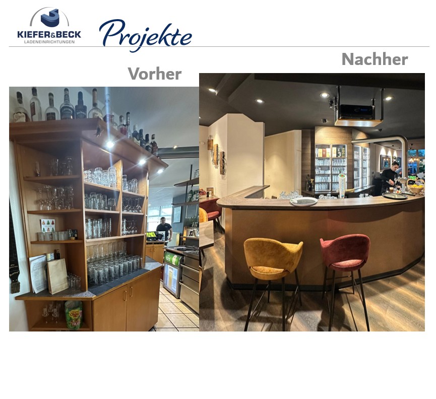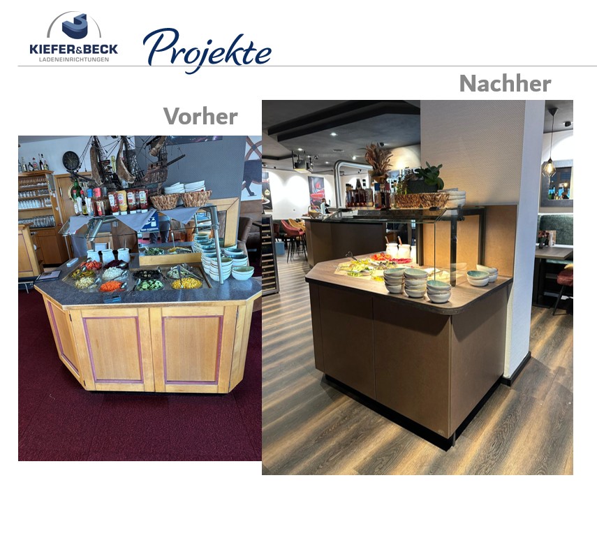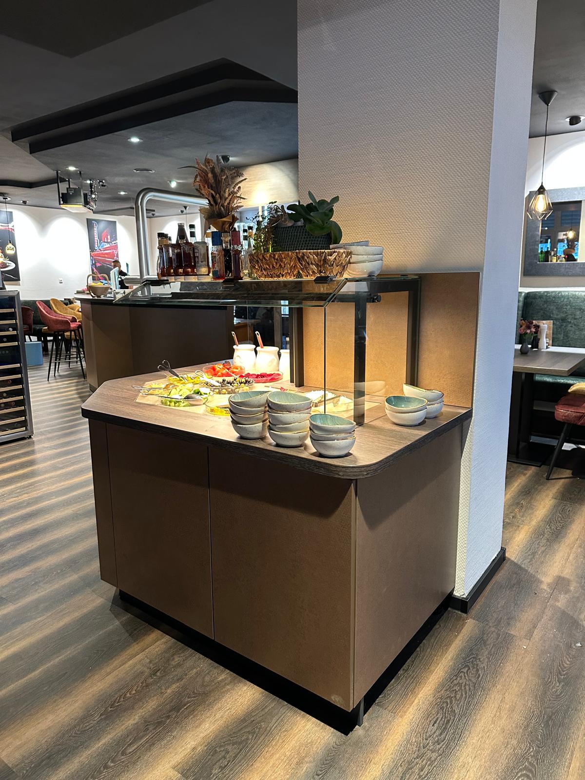 Im Rahmen kleinerer Renovierungsarbeiten rückten wir an und verhalfen der Theke und der Salatbar zu einem schnellen Makeover. Schlicht, modern und in warmen Farben fügt es sich nun wieder gut ein.