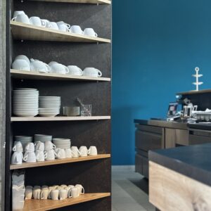 Alles sitzt dort, wo es gebraucht wird: von Thekenhöhen über Stauraum bis zur Technik. Das schafft effiziente Arbeitswege und ein angenehmes Verkaufsumfeld, in einem perfekt ausgeplanten Raum.